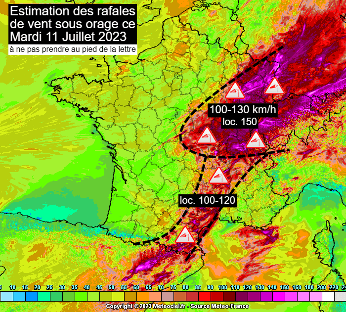 On redoute des chutes de grêle de gros diamètre, pouvant excéder les 5 centimètres ! Cependant, il faudra aussi se méfier tout particulièrement du risque venteux. En effet, il est probable que les rafales soient particulièrement violentes sous les orages, notamment de l'est de la Bourgogne aux frontières allemandes. Ainsi, le modèle AROME modélise des rafales de 100 à 150 km/h, voire localement plus ! Des bourrasques plus locales mais également tempétueuses seront possibles de l'est des Pyrénées vers Rhône-Alpes. S'il s'agit d'une modélisation à ne pas prendre au pied de la lettre, elle témoigne néanmoins d'un potentiel venteux très élevé et possiblement destructeur.