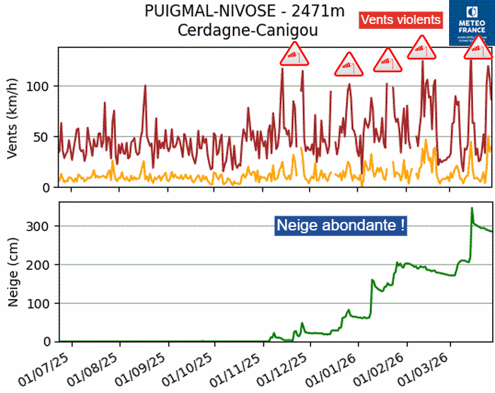 Évolution des rafales de vent et de l'épaisseur de neige à la nivôse de Puigmal (66) depuis juillet 2025 – Via Marie-France