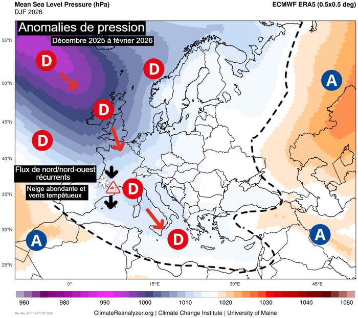 Ceci a eu pour conséquence la circulation récurrente de zones dépressionnaires de l'Atlantique vers la Méditerranée, apportant un courant de nord/nord-ouest persistant provoquant des vents souvent puissants et des chutes de neige récurrentes et abondantes sur les Pyrénées.