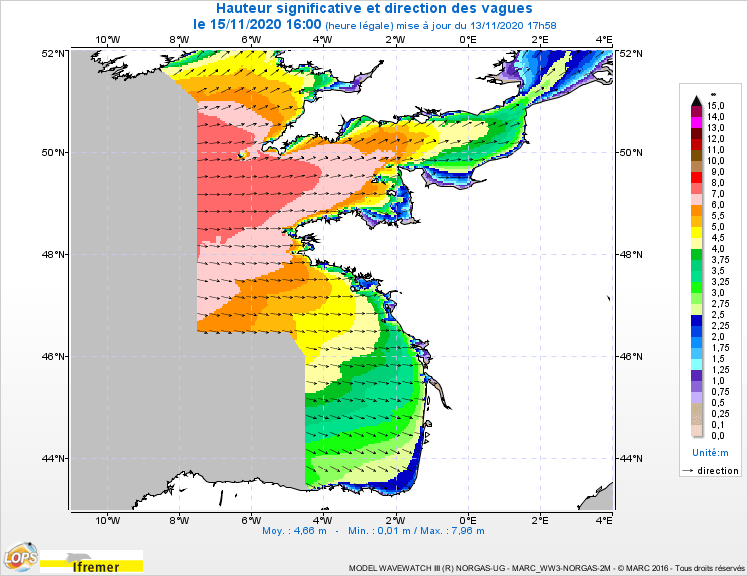 Hauteur maximale des vagues - après-midi du dimanche 15 novembre 2020 - Ifremer