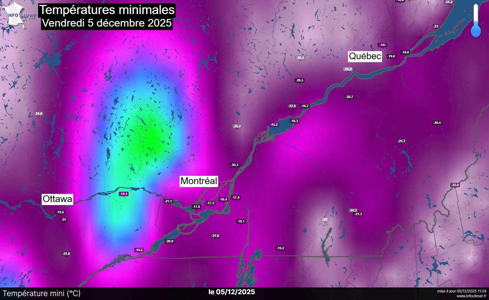 Températures minimales relevées sur le Québec ce 5 décembre 2025 – Infoclimat.fr