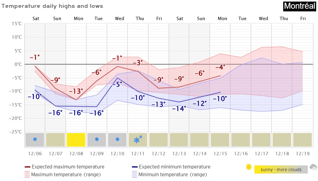 Évolution des températures à Montréal jusqu'à 15 décembre 2025 – Via Météologix