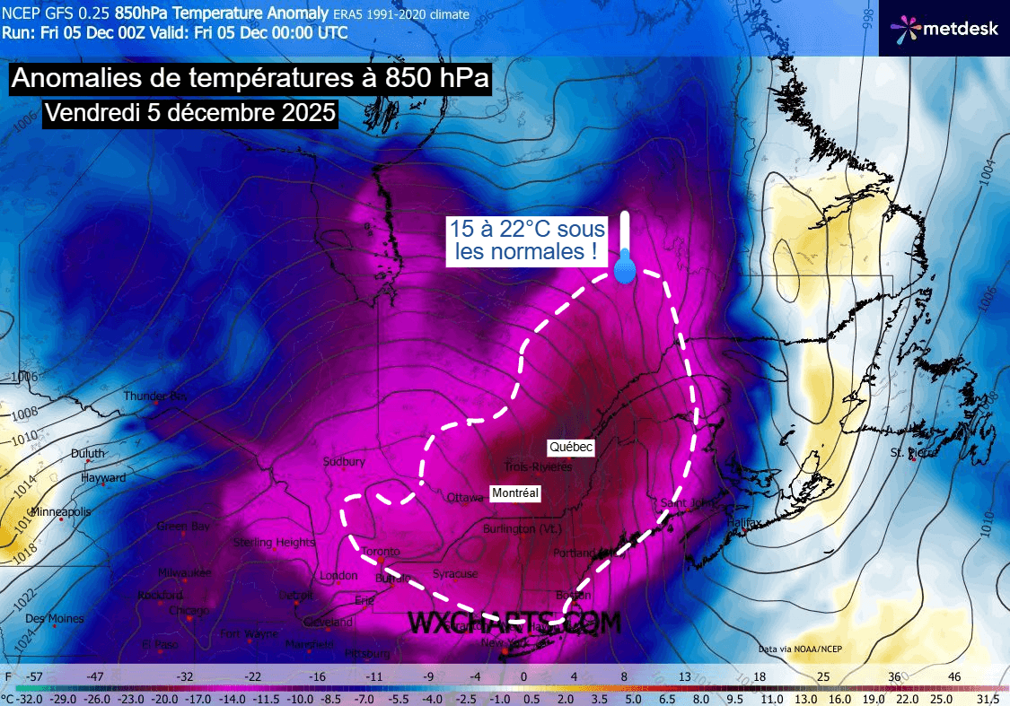 Anomalies de températures à 850 hPa sur l'Est du Canada ce 5 décembre 2025 – Modèle GFS via WX CHARTS