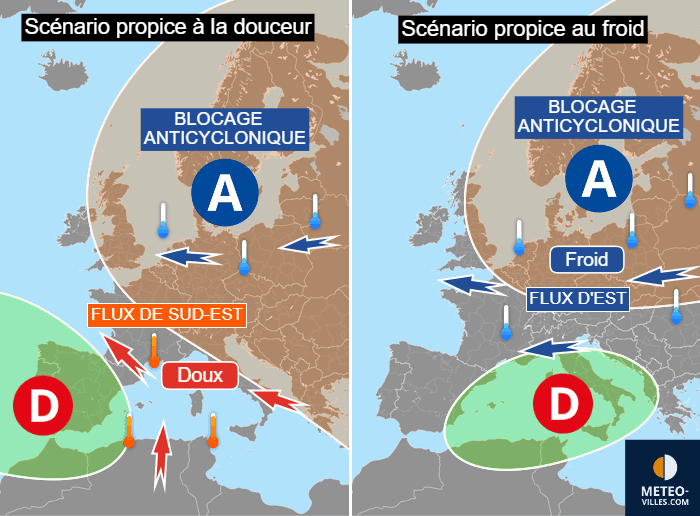 La France se trouvera au carrefour de plusieurs influences. Selon le positionnement des anomalies dépressionnaires sur la péninsule ibérique et la Méditerranée ainsi que de l'extension géographique de l'anticyclone, les conséquences seront bien différentes sur l'hexagone. Si l'activité dépressionnaire principale se cantonne à la péninsule ibérique, c'est un flux de sud-est plutôt doux qui aurait l'avantage en France. En revanche, si les basses pressions s'installent vers l'Italie, elles engendreraient un flux d'est pouvant drainer le froid continental jusqu'à la France. Entre ces deux scénarios, les différences à échelle continentale sont modestes mais elles sont majeures à échelle de notre pays.