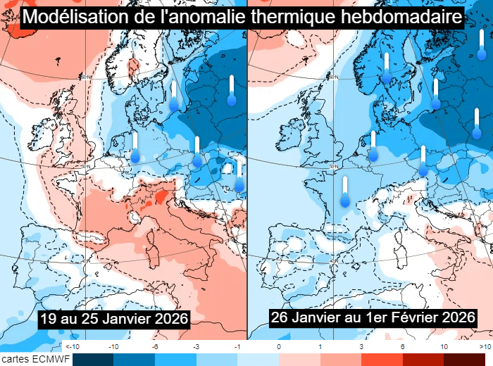Modélisation de l'anomalie thermique du 19 au 25 janvier et du 26 janvier au 1er février 2026 - ECMWF