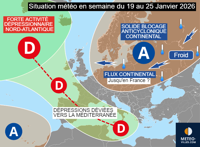Un puissant anticyclone s'installe sur l'ouest de la Russie et ne fera que se renforcer en fin de semaine. Ainsi, un blocage anticyclonique durable va se mettre en place sur l'est et le centre du continent européen, perdurant au cours de la semaine du lundi 19 au dimanche 25 janvier 2026. Par conséquent, les dépressions nord-atlantiques auront tendance à plonger vers le golfe de Gascogne et le bassin méditerranéen. C'est donc un flux continental qui se mettra en place sur une bonne partie de l'Europe. Reste à savoir si le flux d'est parviendra à amener l'air froid jusqu'en France.