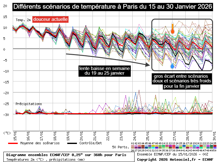 Différents scénarios de température à Paris du 15 au 30 janvier 2026 - meteociel.fr