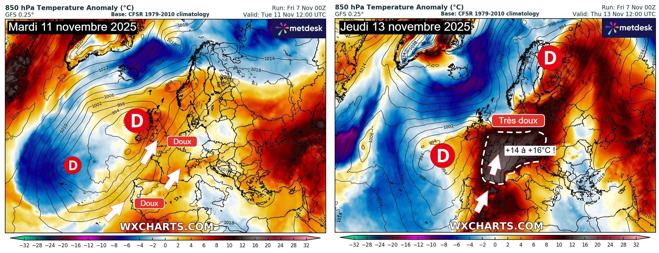 Anomalies de températures à 850 hPa sur l'Europe mardi 11 et jeudi 13 novembre 2025 – Modèle GFS via WX CHARTS