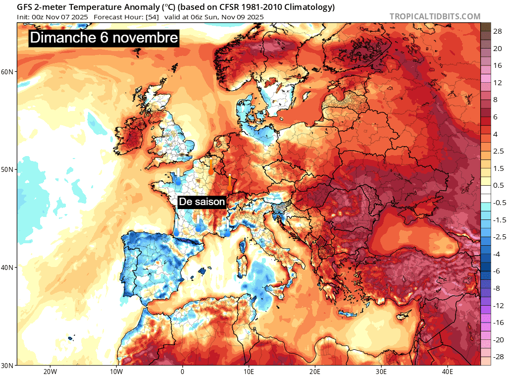 Anomalies de températures à 2m sur la France ce dimanche 9 novembre 2025 – Via TropicalTidBits
