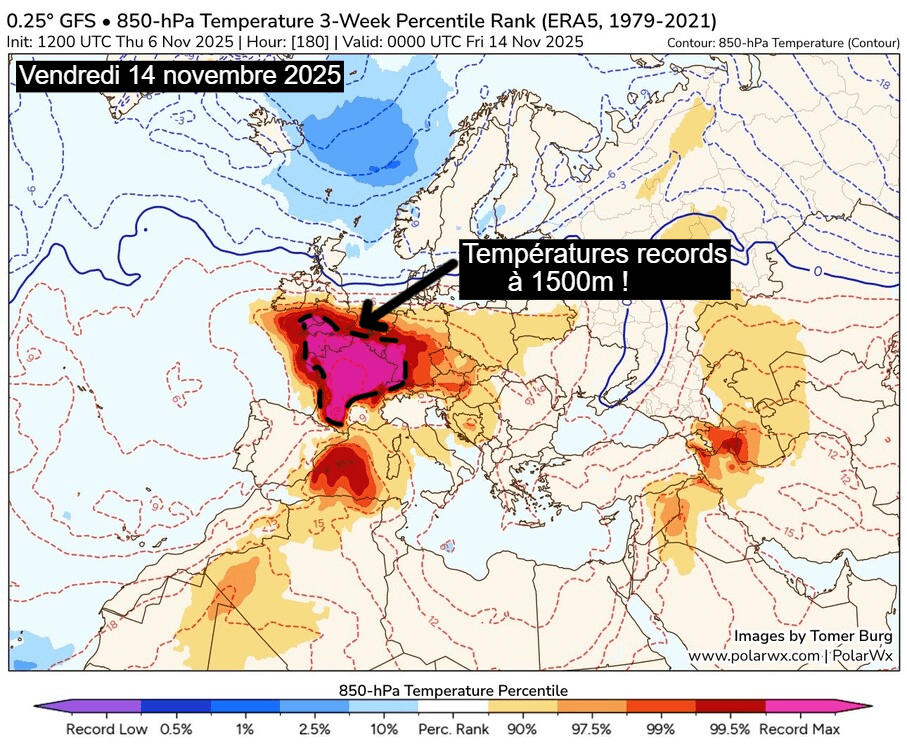 Il est ainsi probable que nous nous approchions voire que nous battions des records de douceur à 850hPa (environ 1500m d'altitude), notamment entre jeudi 13 et vendredi 14 novembre qui devraient s'avérer les journées les plus douces de la semaine.