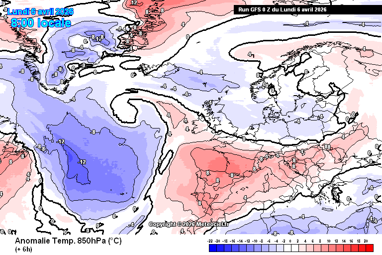 Animation des anomalies températures à 850 hPa sur l'Europe du 6 au 10 avril 2026 – Modèle GFS via meteociel