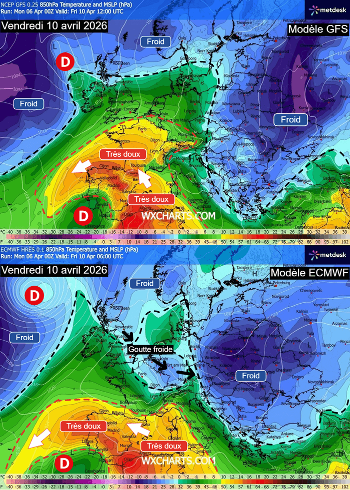 Comparaison de la situation prévue entre les modèles GFS et ECMWF pour le 10 avril 2026 – via WX CHARTS