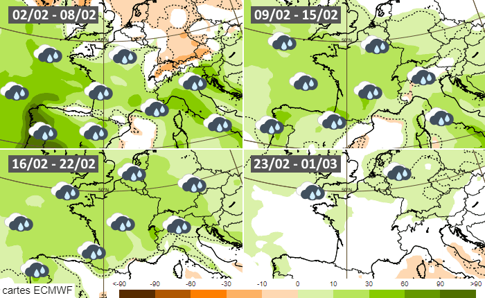 Nous sortons d'un mois de janvier 2026 qui a été particulièrement arrosé dans l'ouest et le sud de la France et ce mois de février a débuté sous une météo bien humide. Selon les tendances à plusieurs semaines, tout indique que cette humidité va perdurer. En effet, le courant océanique dépressionnaire semble vouloir se maintenir au cours des trois prochaines semaines. Le modèle européen ci-dessous projette une anomalie humide marquée sur une grande partie de la France. Les précipitations pourraient reculer quelque peu en fin de mois, mais rien n'est acquis à cette échéance.