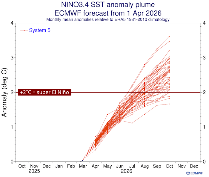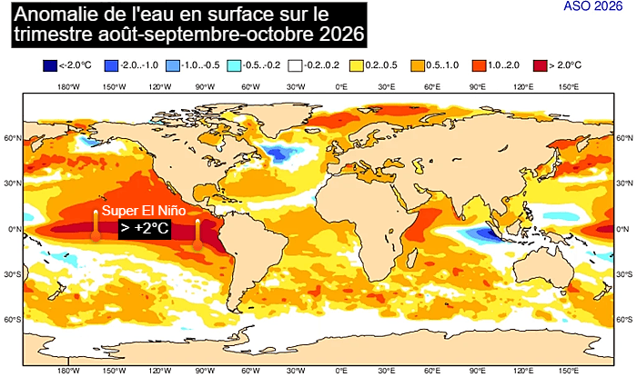 La plupart des modèles convergent désormais vers le scénario d'un "super El Niño". Le graphique ci-dessous montre que l'événement débutera dans les prochaines semaines et pourrait devenir majeur dès cet été 2026 avec un franchissement du seuil symbolique de +2°C d'anomalie pour les eaux de l'est du Pacifique équatorial. Certains scénarios vont même jusqu'à +3°C, ce qui pourrait faire de cet épisode d'El Niño l'un des plus forts jamais observés !