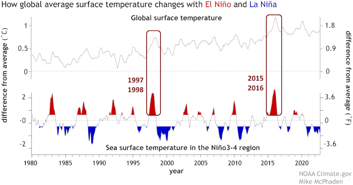 Corrélation entre El Niño / La Niña (en bas) et température moyenne sur Terre (en haut) - NOAA