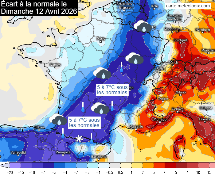 Écart à la normale des températures en après-midi du dimanche 12 avril 2026 - meteologix.com