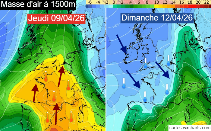 La masse d'air venue du Maroc alimentera l'ensemble de la France jusqu'au jeudi 9 avril 2026. En altitude, les températures seront proches des 15°C vers 1500m dans le sud-ouest de la France, des niveaux dignes de l'été. Une première incursion d'air frais concernera le nord vendredi 10 avril mais celle-ci sera repoussée vers l'Allemagne samedi 11 avril, tandis que l'air frais sera en embuscade par l'océan. Le changement drastique est surtout prévu pour le dimanche 12 avril avec le passage d'un talweg qui amènerait une masse d'air sous le 0°C à 1500 mètres, synonyme de très net rafraîchissement !