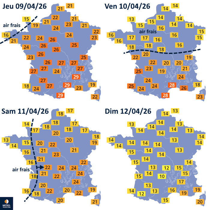 Ainsi, les températures seront encore estivales dans les 2/3 sud jeudi 9 avril 2026 et printanières au nord. L'air frais gagnera les côtes de la Manche avant de concerner la moitié nord vendredi 10 avril, plus net vers les frontières où nous devrions repasser sous les 15°C. Une nouvelle hausse se produira samedi 11 avril avant l'arrivée probable d'un front par l'océan en fin de journée, amenant une masse d'air sensiblement plus frais qui envahirait le pays dimanche 12 avril. Une grande partie de la France repasserait sous les 15°C, perdant entre 10 et 15 degrés en quelques jours !
