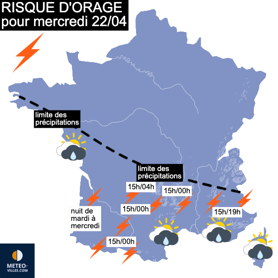 Carte METEO-VILLES, du risque d'orage pour mercredi 22 avril 2026
