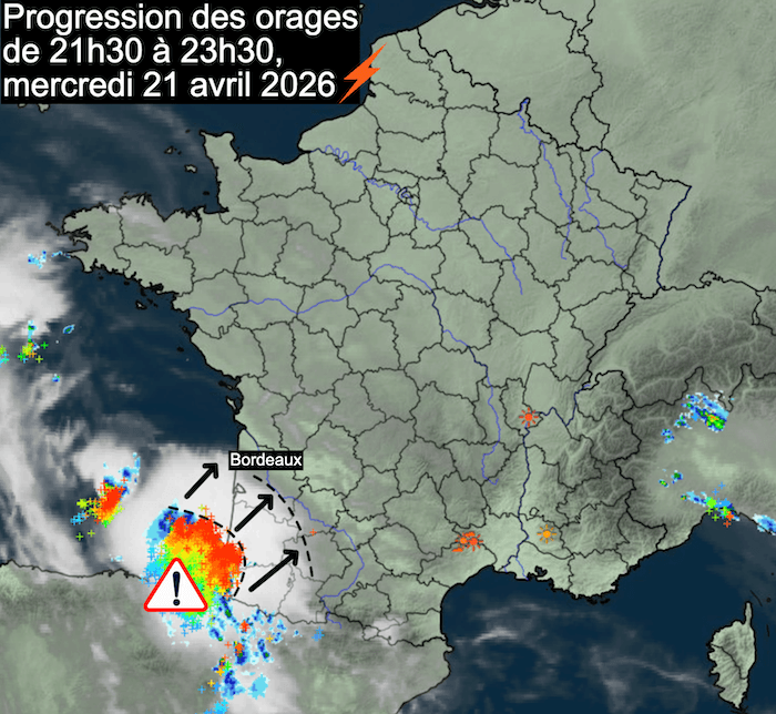 Ces cellules orageuses se sont ensuite déplacées progressivement vers le nord, atteignant la côte landaise avant minuit.