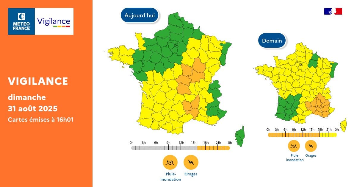 Vigilance météo pour dimanche 31 août et lundi 1er septembre 2025