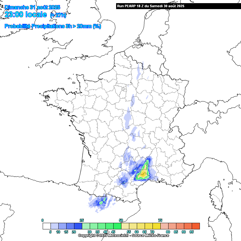Probabilité de pluies intenses (plus de 20 mm en 3h), entre dimanche 23 h et lundi 20 h
