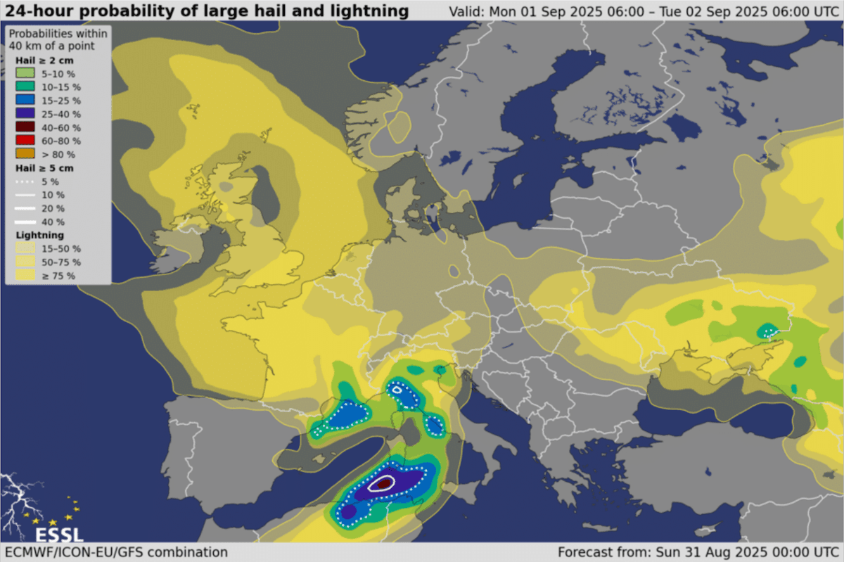 Risque orageux et de grêle en Europe dans la journée de lundi - modèle météo européen