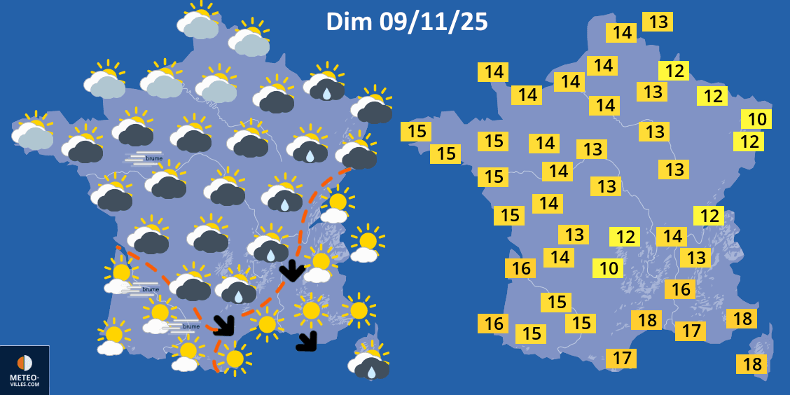 La journée du dimanche 9 novembre 2025 va rester nébuleuse dans plus des deux tiers de la France. La grisaille distillera même quelques bruines ou pluies fines du Massif Central à la Lorraine. En revanche, de belles éclaircies se développeront au sud de la Garonne en après-midi et le soleil sera généreux des Alpes au bassin méditerranée, sauf en Corse où une ondée sera encore possible. Les températures maximales vont légèrement fléchir, s'établissant le plus souvent entre 12 et 15°C. Il fera plus doux en Méditerranée avec 17 ou 18°C.