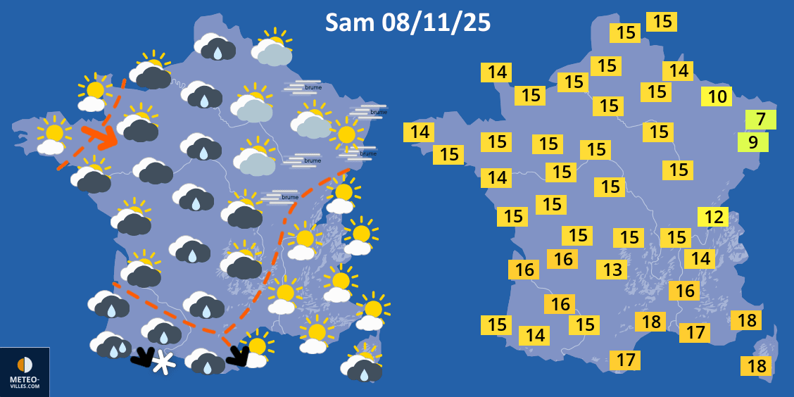 Ce samedi 8 novembre 2025 s'annonce gris du sud-ouest au nord avec un faible apportant de faibles pluies, de plus en plus espacées au fil des heures. Elles resteront régulières sur les départements pyrénéens avec des chutes de neige au dessus de 1800 mètres. Notons que les nuages bas seront sans doute tenaces du val de Saône à la plaine d'Alsace. Toutefois, le sud-est tirera son épingle du jeu avec le retour d'un soleil dominant. De belles éclaircies se développeront aussi sur la Bretagne et la Manche. Il fera plutôt doux pour la saison avec 14 à 16°C en moyenne et 17 à 18°C en Méditerranée. Sous les nuages bas tenaces alsaciens, on prévoit seulement 7 à 9°C.