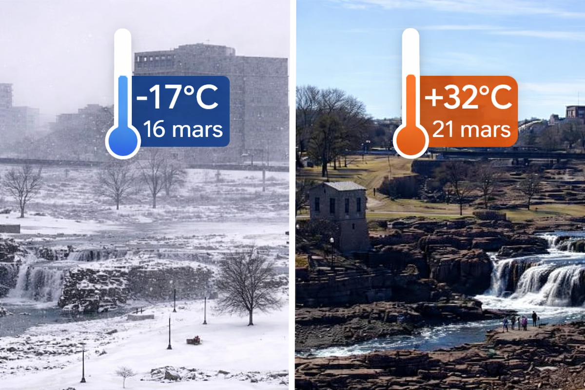 Entre le 16 mars 2026 et le 21 mars 2026, On a parfois observé jusqu'à 50°C d'écart  dans certains secteurs du nord des États-Unis, comme à Sioux Falls dans le Dakota-du-Sud - Webcam : Windy