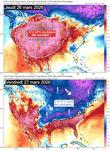 La carte ci-dessous permet de mieux prendre la mesure de l'ampleur spectaculaire de cette vague de chaleur. Le vendredi 20 mars 2026, près des 3/4 des États-Unis enregistreront des températures 10 à 20°C supérieures aux normales saisonnières ! L'anomalie est aussi remarquable pour son intensité que pour son étendue ! Plus concrètement, on atteindra les 30°C dans des régions où la normale n'est que de 12°C à cette saison et il fera plus de 40°C dans des zones où les températures de saison se situent autour de 25°C...